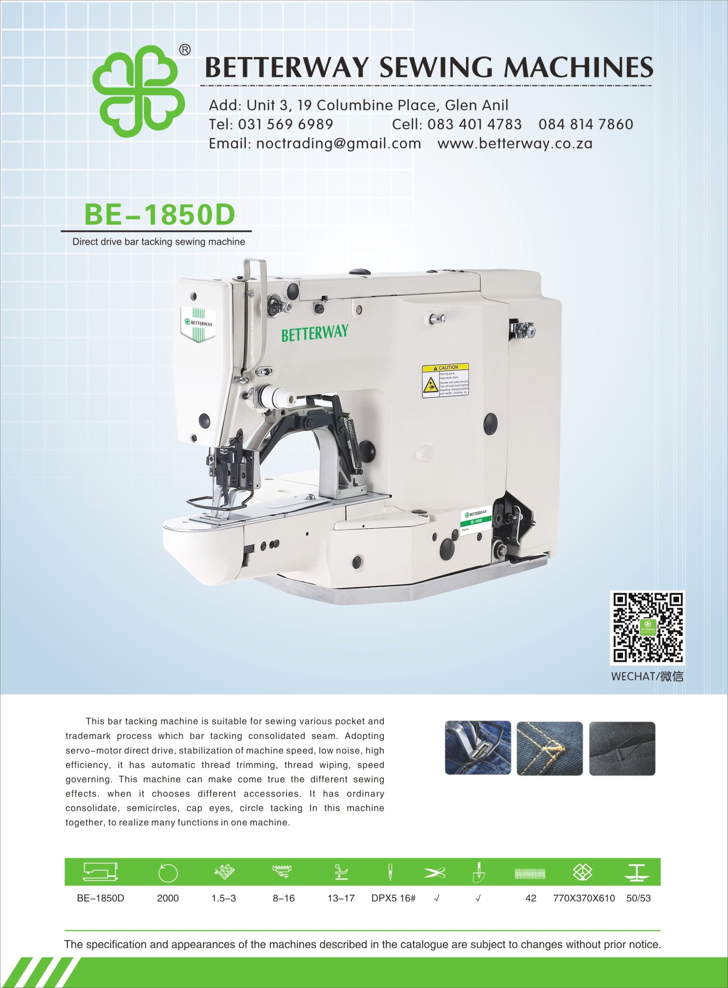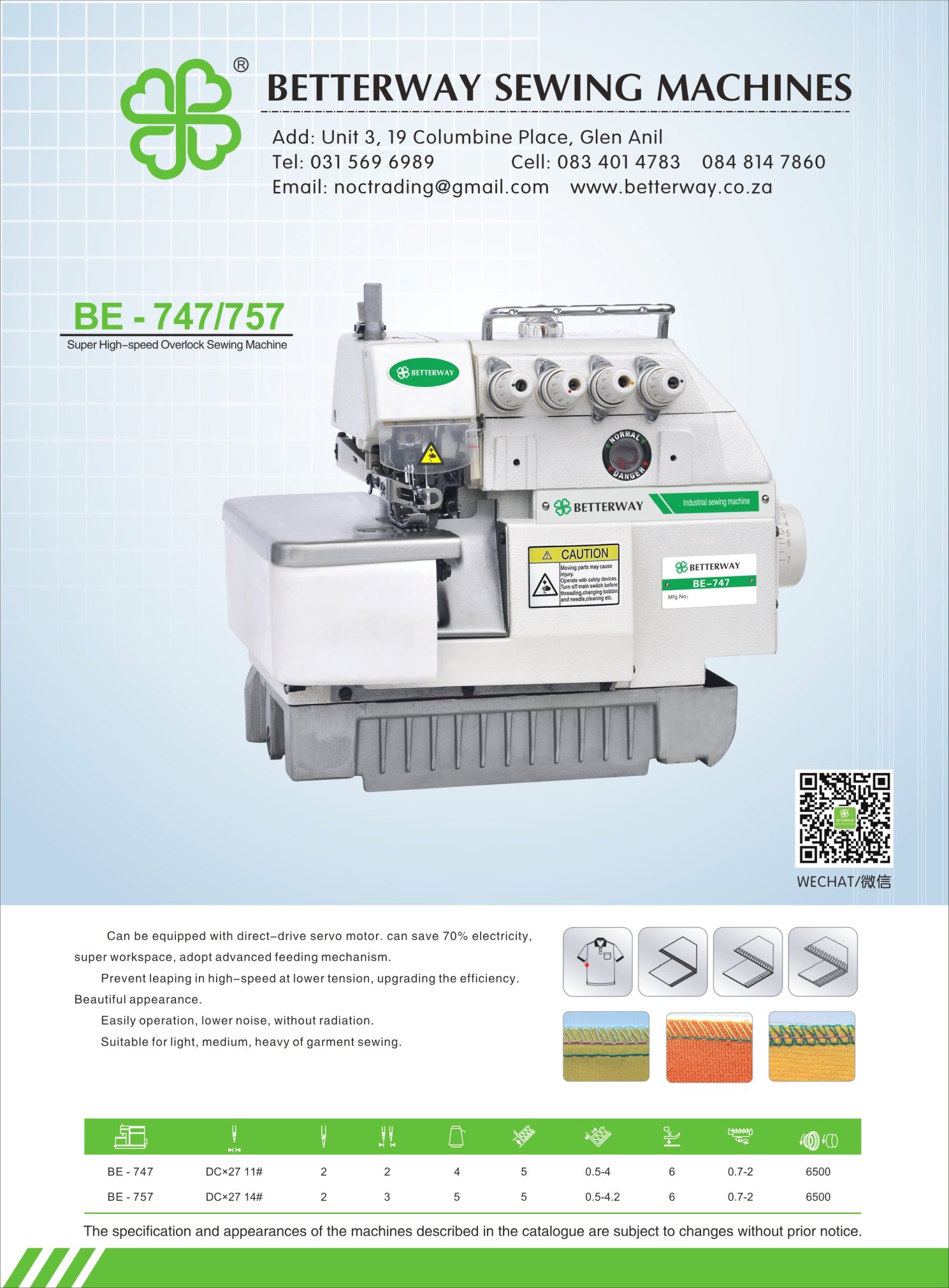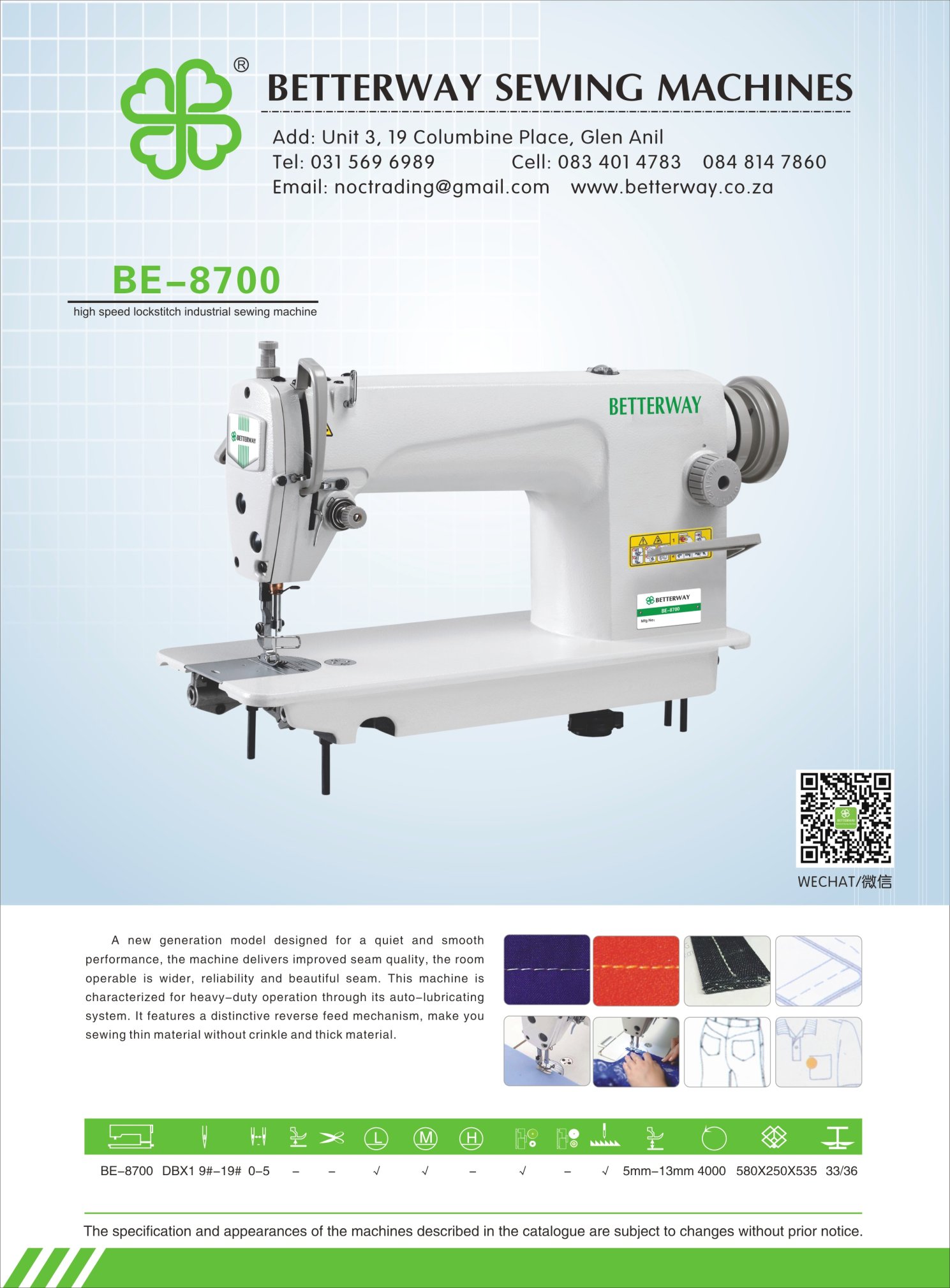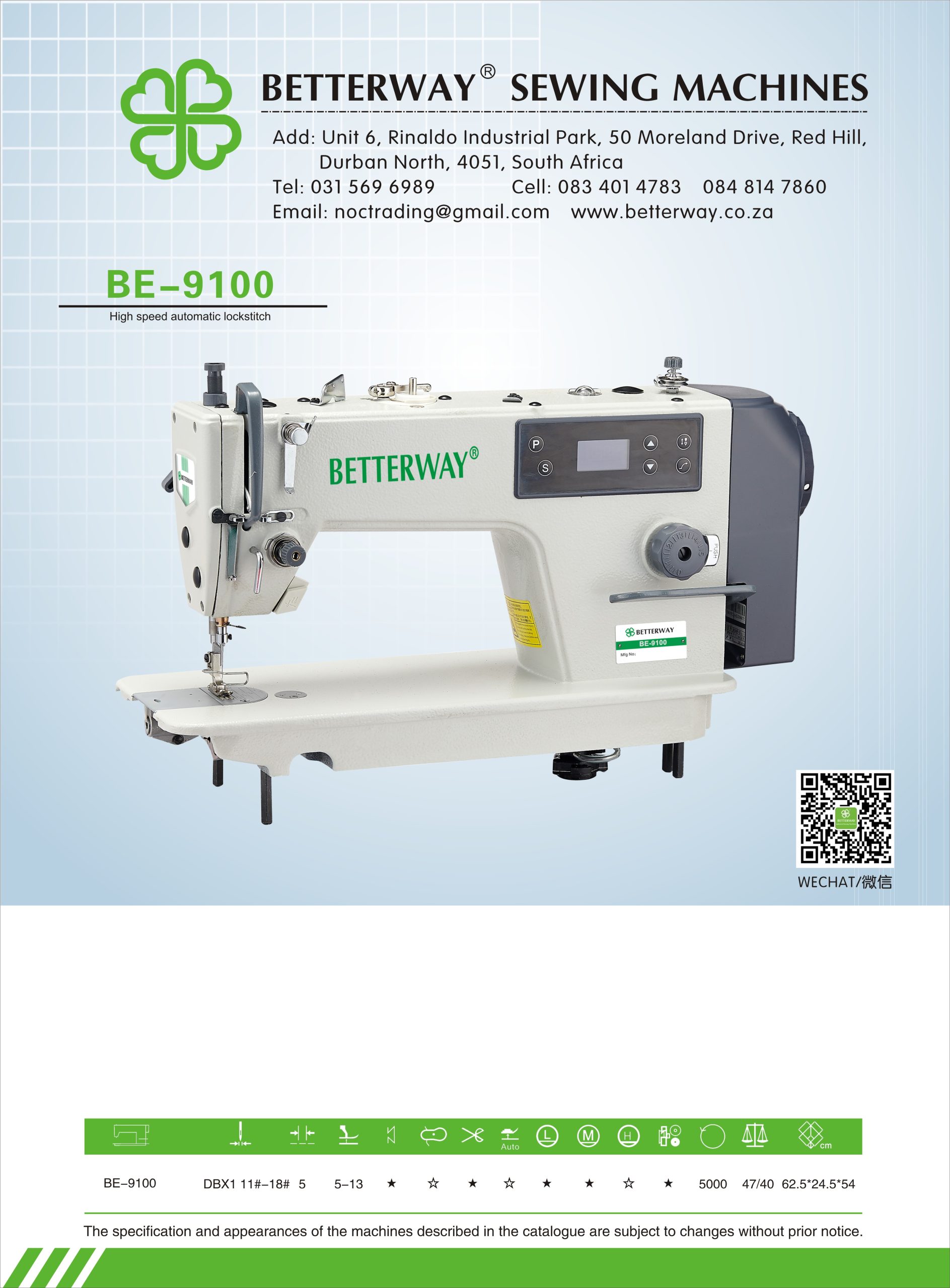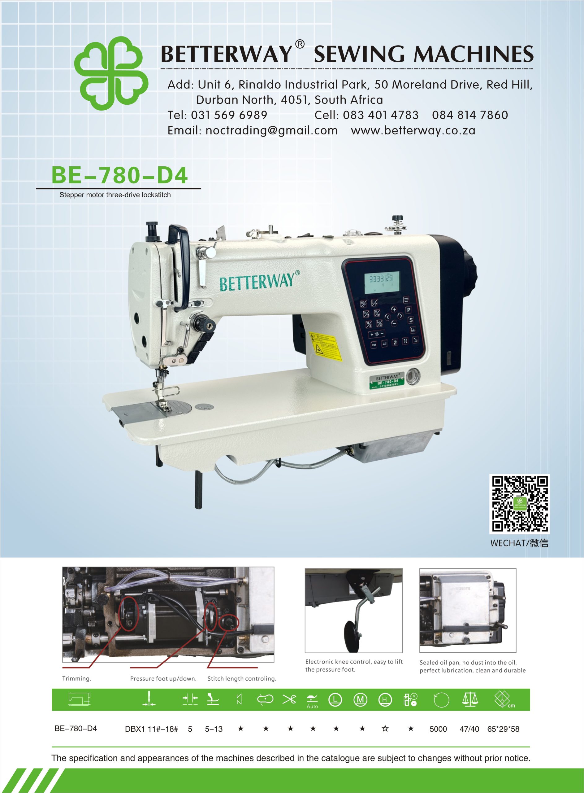 Established in 2016. Durban based importer and distributor for industrial sewing machines and allied products. Mainly engaged in industrial sewing machine sales, sewing machine parts and maintenance.