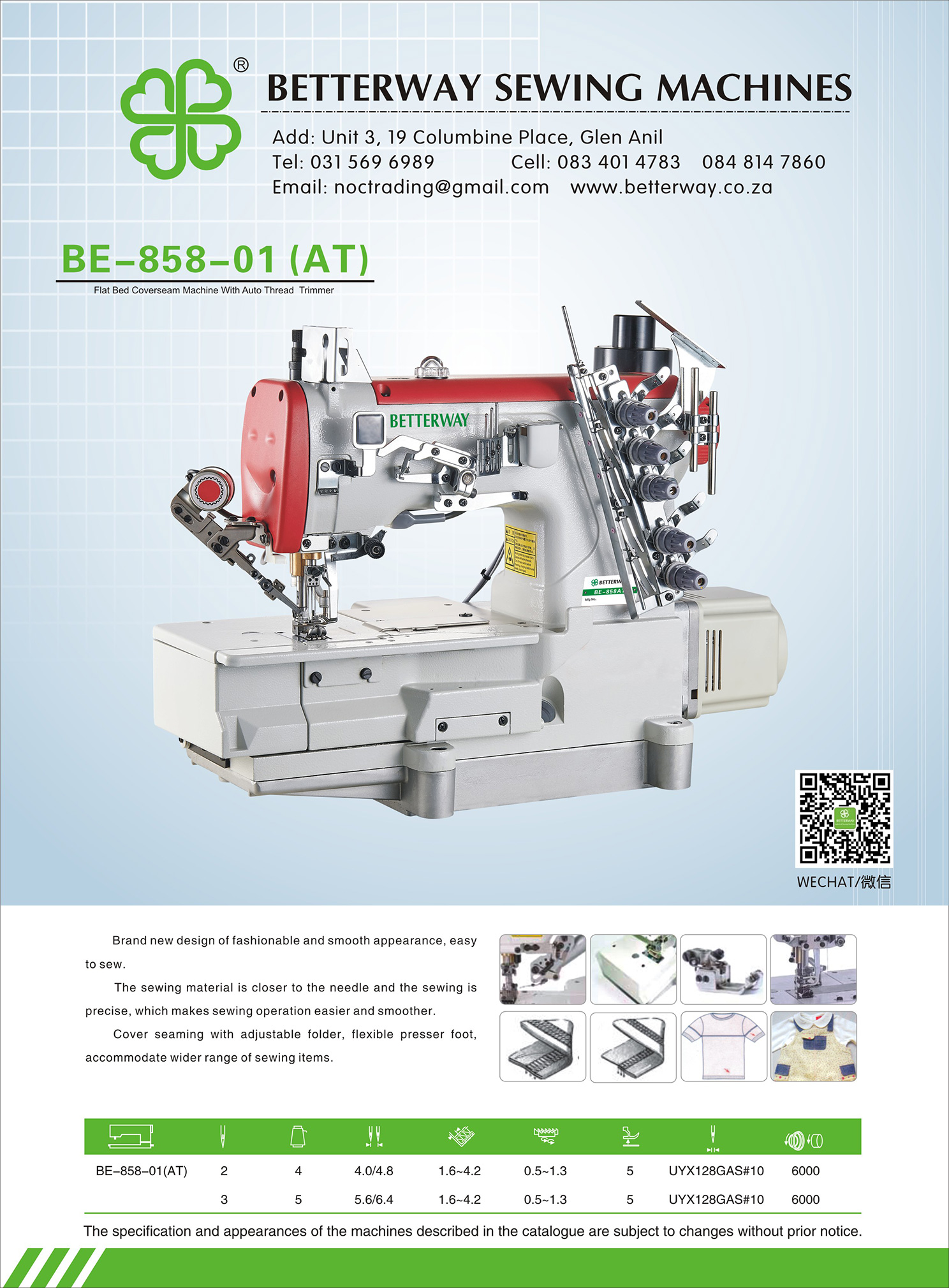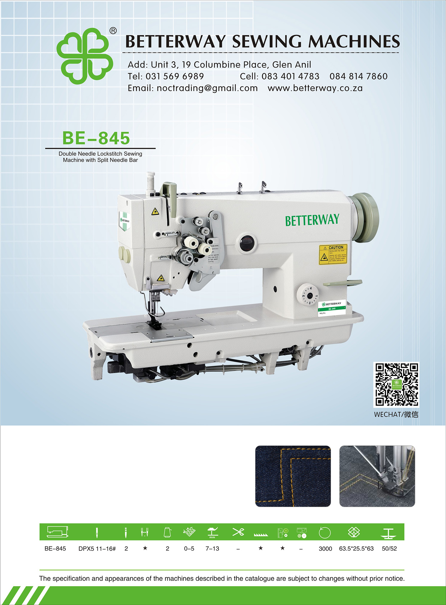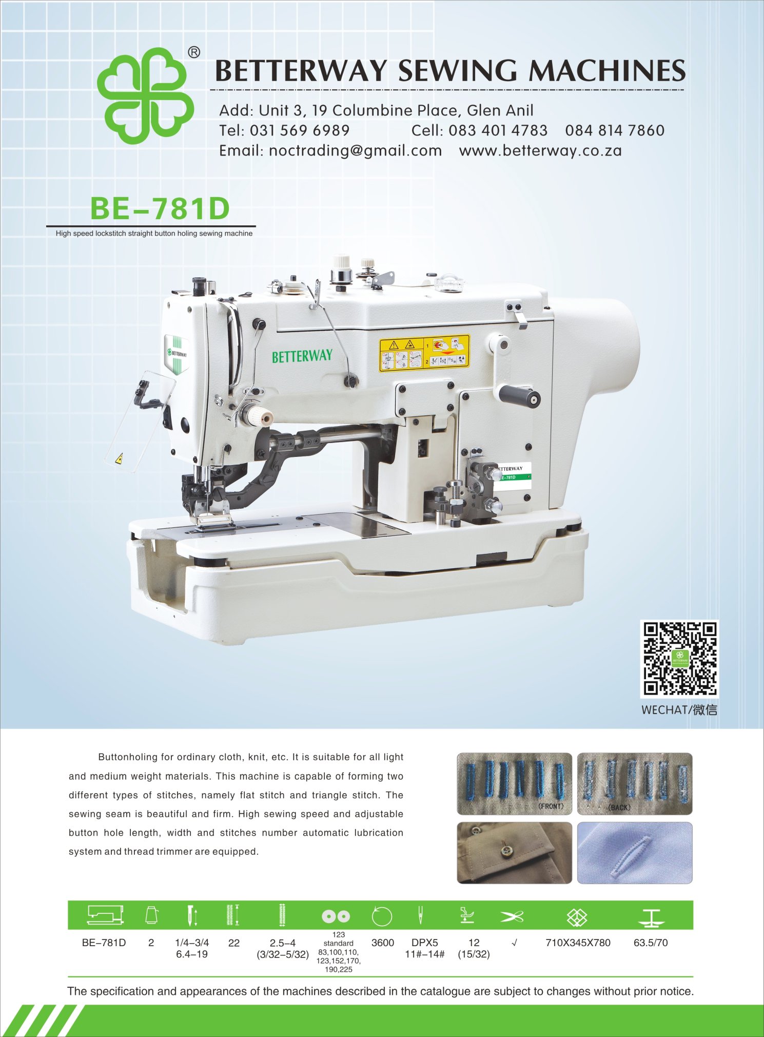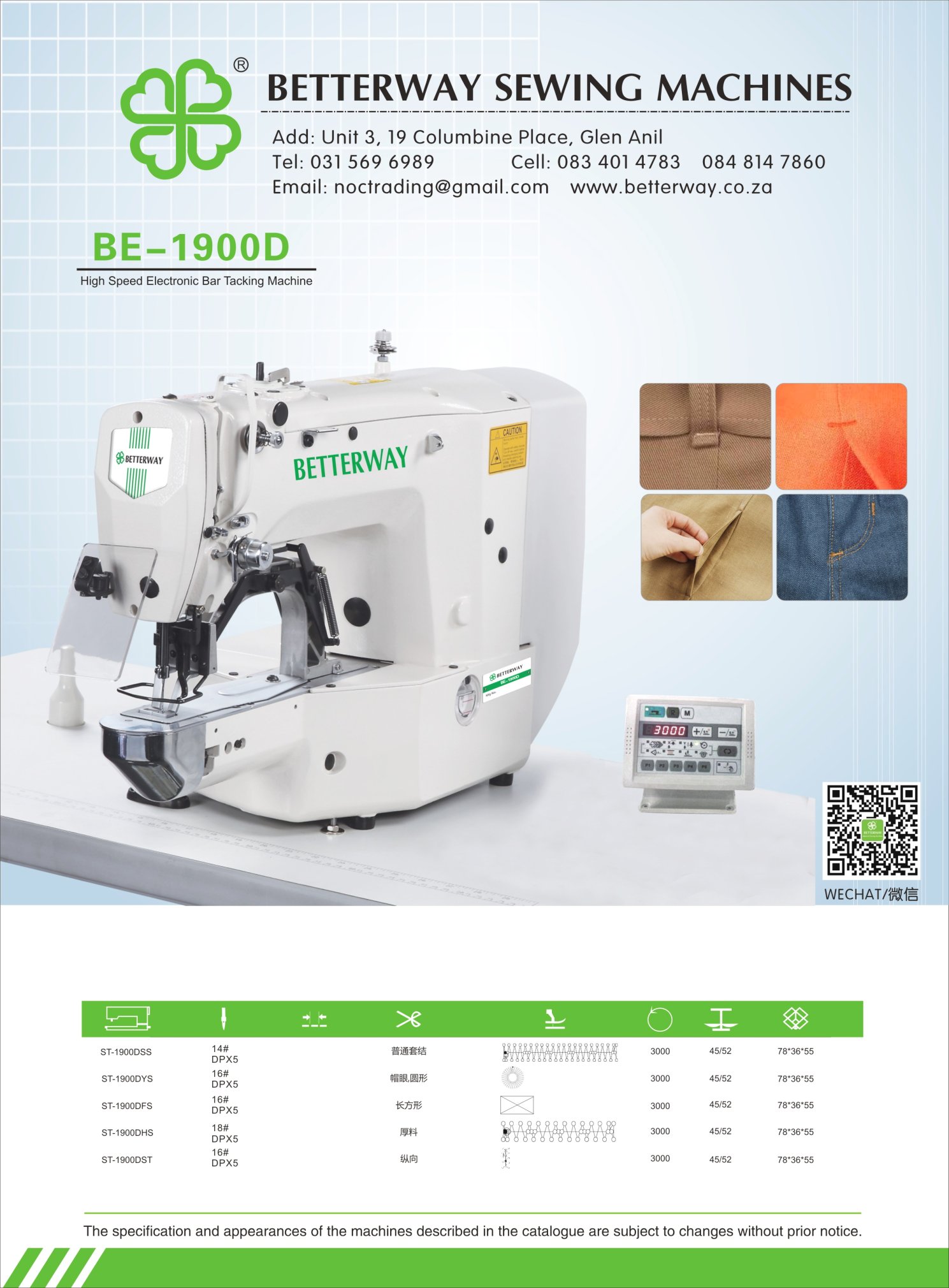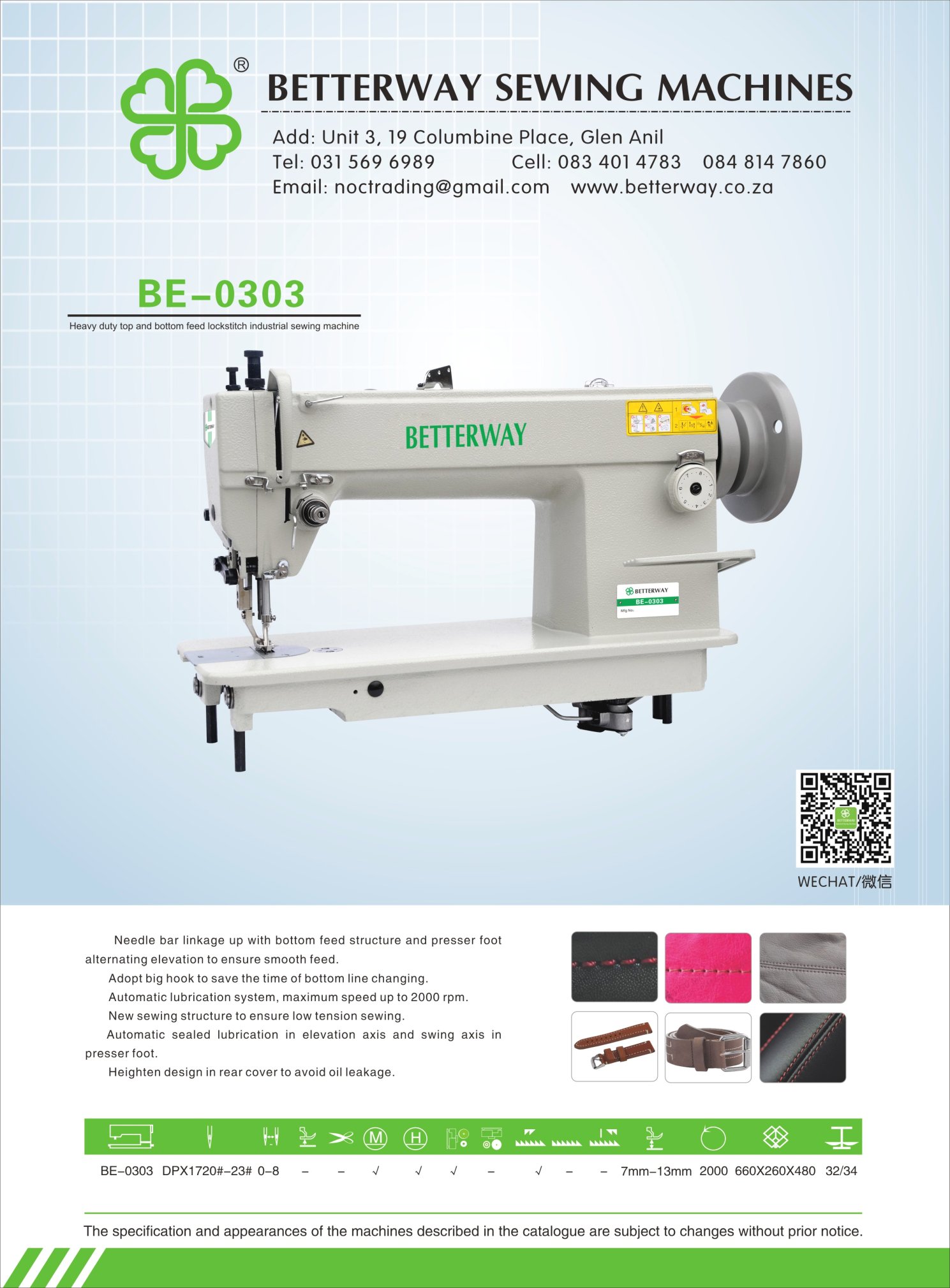 Established in 2016. Durban based importer and distributor for industrial sewing machines and allied products. Mainly engaged in industrial sewing machine sales, sewing machine parts and maintenance.
